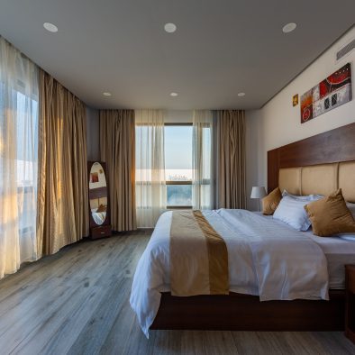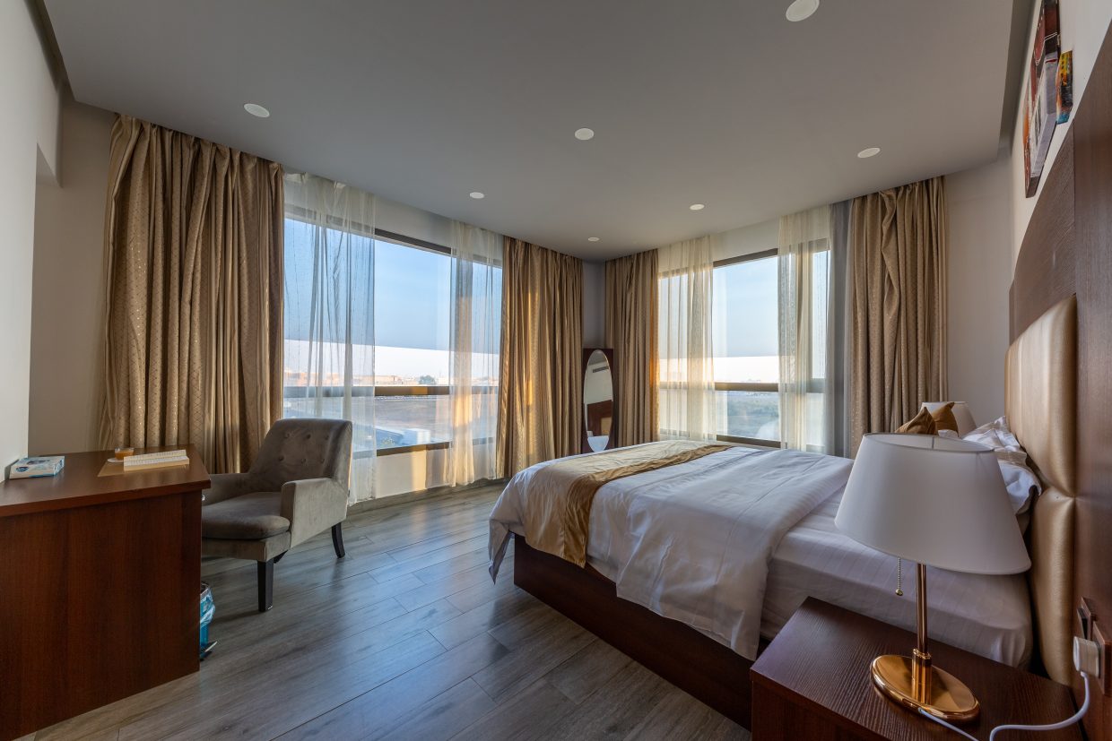 يتكون الجناح من غرفة نوم أنيقة تضم سريرًا مزدوجًا كبيرًا وصالة مريحة مجهزة بأثاث عصري ومساحة مثالية للاسترخاء أو التجمعات العائلية.